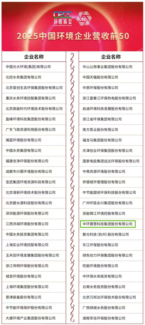 “中國環(huán)境企業(yè)營收前50”(原“中國環(huán)境企業(yè)50強”)榜單由環(huán)境商會自2018年起每年發(fā)布,在業(yè)界享有極高的公信力和權(quán)威性。本次評選嚴(yán)格按照往屆評選標(biāo)準(zhǔn),以企業(yè)申報為基礎(chǔ),以公正公開為原則,以真實數(shù)據(jù)為依據(jù),結(jié)合上規(guī)模環(huán)境企業(yè)調(diào)研,按照2024年度營業(yè)收入總額降序排列產(chǎn)生,旨在凸顯領(lǐng)軍企業(yè)示范引領(lǐng)作用,推動產(chǎn)業(yè)高質(zhì)量發(fā)展。中環(huán)寰慧集團(tuán)曾入選“2023中國環(huán)境企業(yè)50強”榜單,本次再次入選,是市場與行業(yè)對其長期深耕、穩(wěn)健增長的高度認(rèn)可。